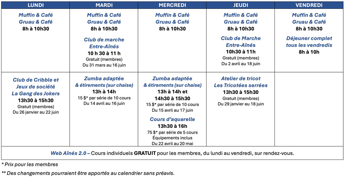 - Muffin & café (3$) et Gruau & café (4$) tous les matins